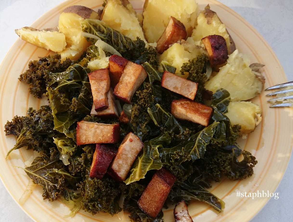 Below we have a typical winter dish: kale with jacket potatoes and roasted strips of smoked tofu, which can also be refined with a mild mustard.