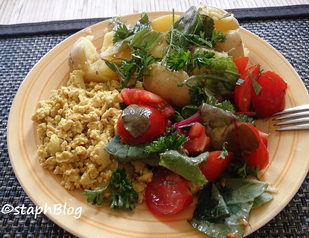 Scrambled tofu with potatoes in the skin and tomato salad. For the scrambled tofu you need: